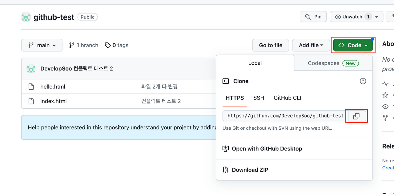 1. 프로젝트의 github 주소를 복사한다